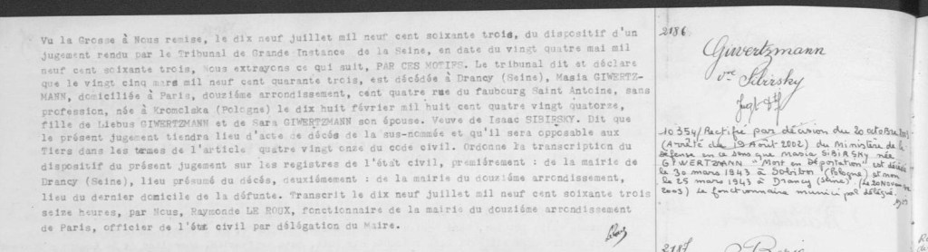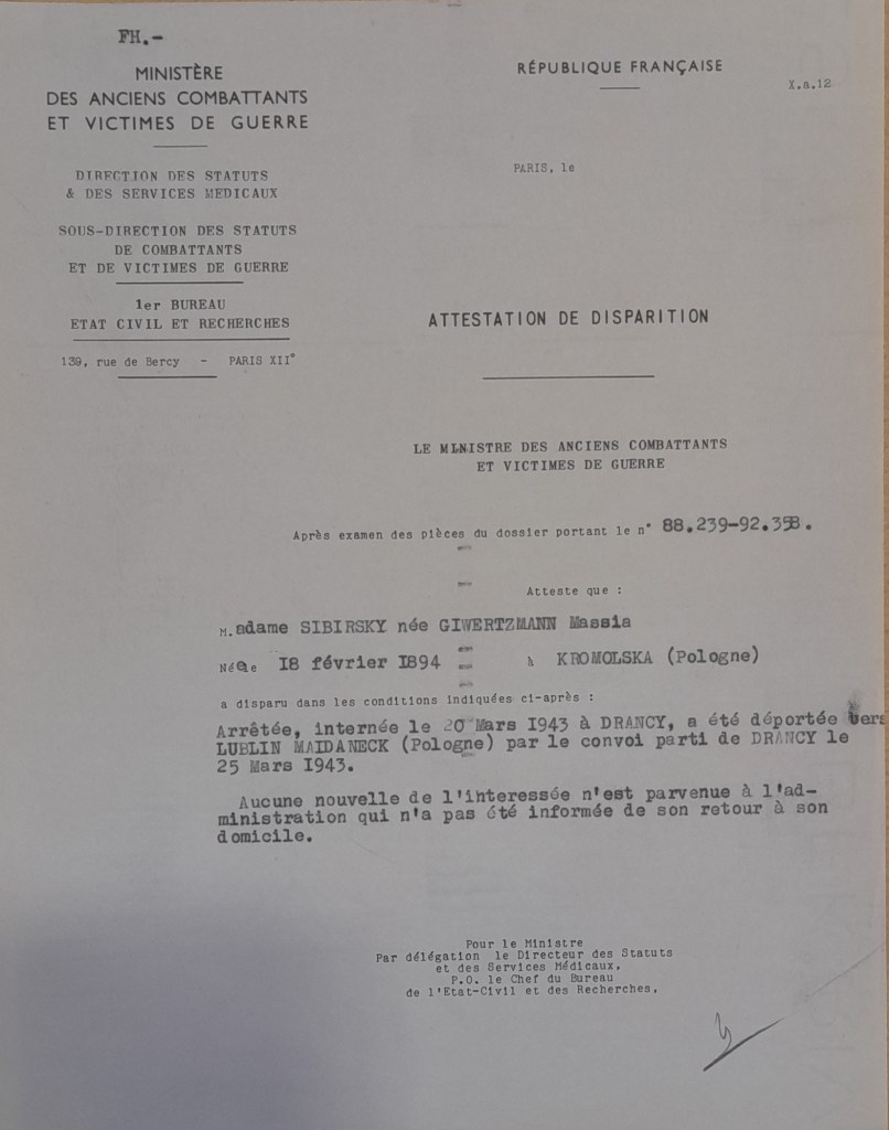 A la demande des filles survivantes de Massia, Rosa et Denis, le certificat de disparition de leur mère sera établi en 1962, sésame nécessaire pour déclarer son décès. Le décès de Massia et de Raymond ne sera acté qu’en 1963, presque 20 ans après leur disparition.