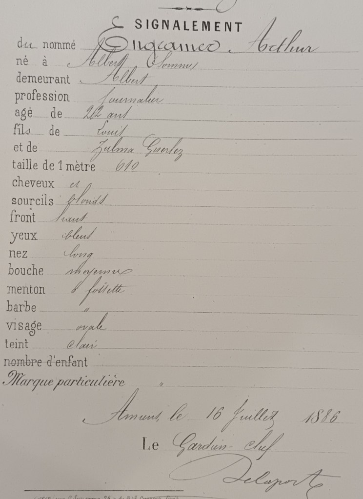 Arthur Engramer est le fils de Louis et de Zulma. Il est né le 18 Novembre 1863 dans la commune d’Albert. Il est le seul garçon de la famille, face à trois sœurs : Marie, Louisa et Blanche.