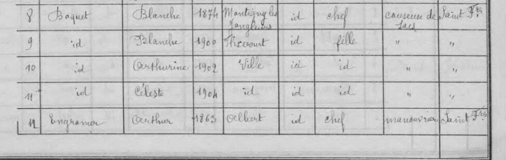 Et les recensements de la période 1906 à 1936 de Ville le Marclet ne font que le confirmer, Arthur étant considéré comme pensionnaire, voir ami de Blanche Barbier. Les ans verront ajouter Céleste et René à la famille, jusque 1911 avec la naissance de Germaine.